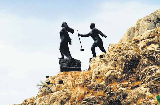 Heykelde, Ferhat'ın öldüğünü öğrenen Şirin'in kendini dağdan aşağı atması canlandırıldı.