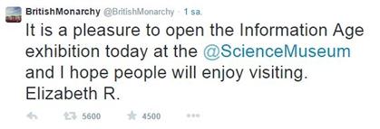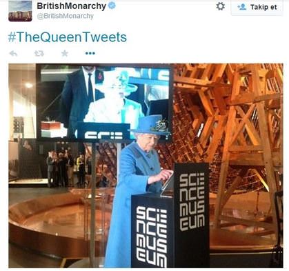 İngiltere Kraliçesi 2. Elizabeth, sosyal medya ağı Twitter'ı kullanarak ilk tweetini attı. Kraliçe ilk twetinde, 'Bugün Bilim Müzesi'nde Bilgi Çağı sergisini açmaktan memnuniyet duydum. Umarım insanlar ziyaret etmekten keyif alır. Elizabeth R' ifadesine yer verdi.