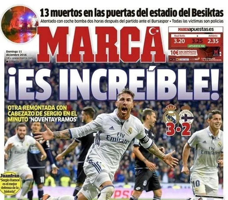Hain saldırıyla ilgili en anlamlı tepkilerden biri de İspanya'nın yüksek tirajlı spor gazetesi Marca'dan geldi. İspanyol gazetesi, bugün çıkan sayısında logosuna ay yıldız ekledi.