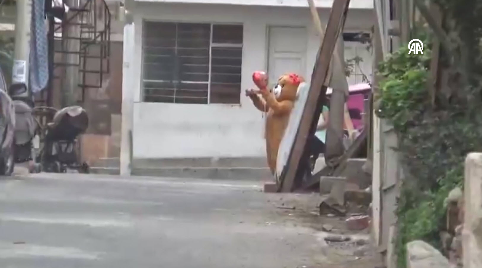 Kadına çiçek ve çikolata götürerek operasyonu başlatan ayı kosümlü polis, kadının evinin önünde beklemeye başladı.