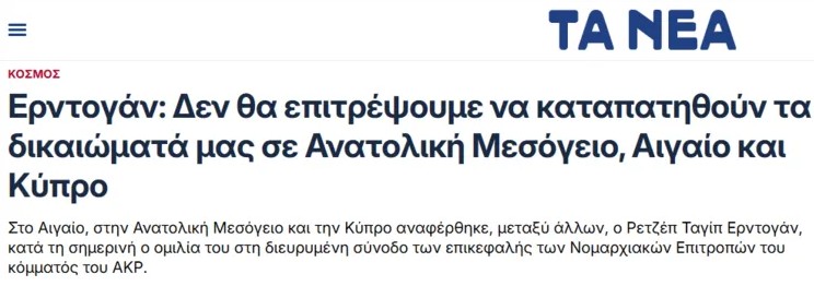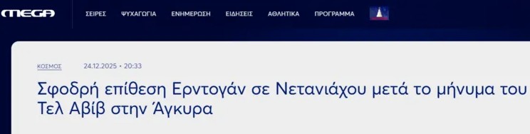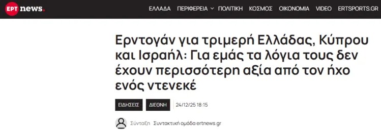 İsrail'de düzenlenen Tel Aviv-Lefkoşa-Atina üçlü zirvesinin ardından Başkan Recep Tayyip Erdoğan'dan gelen sert mesajlar, Yunan basınında geniş yer buldu. Yunan medya kuruluşları, Erdoğan'ın açıklamalarını "karşı atak" ve "sert çıkış" manşetleriyle duyururken, İsrail Başbakanı Binyamin Netanyahu'nun sözlerinin "boş teneke tıngırtısına" benzetilmesi özellikle dikkat çekti.