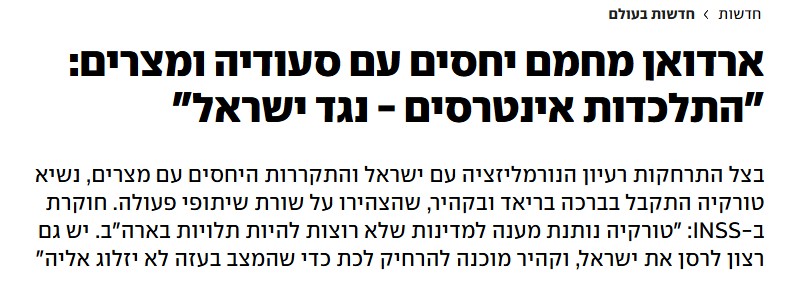 Yedioth Ahronoth'un haberine göre Erdoğan, önce Suudi Arabistan'da sıcak bir temas trafiği yürüttü, ardından Mısır'a resmi ziyaret gerçekleştirdi. Bu ziyaretlerde Türkiye ile Mısır ve Suudi Arabistan yönetimleri, çok sayıda iş birliği başlığı üzerinde mutabakata vardı.