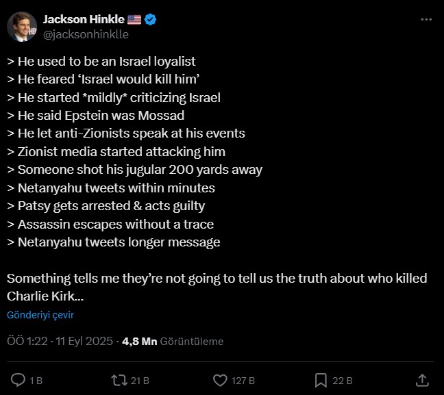 Donald Trump'a yakınlığıyla bilinen muhafazakâr siyasetçi Charlie Kirk'in suikastı hakkında, Amerikalı siyasetçi Jackson Hinkle, olayın arkasında İsrail'in olduğuna dikkat çekti.