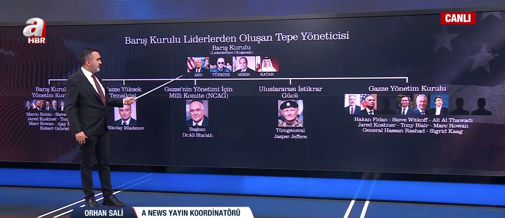 Barış Kurulu'nun yönetim kademesinde yer alan isimlerin uluslararası dengeleri değiştirecek nitelikte olduğunu ifade eden Sali, "Yönetim kurulunda ABD Dışişleri Bakanı Marco Rubio, Trump'ın Ortadoğu Özel Temsilcisi Steve Witkoff, Jared Kushner, eski İngiltere Başbakanı Tony Blair, New Yorklu yatırımcı Mark Rowan, Dünya Bankası Başkanı Ajay Banga ve ABD Ulusal Güvenlik Danışmanı Robert Gabriel yer alıyor" bilgisini paylaştı. Gazze'deki tüm koordinasyonu yürütecek isimden de bahseden Sali, "Gazze Yüksek Temsilcisi olarak Bulgar siyasetçi Nikolay Mladenov'u çokça duyacağız, iletişim bu isim üzerinden yürüyecek" ifadelerini kullandı.