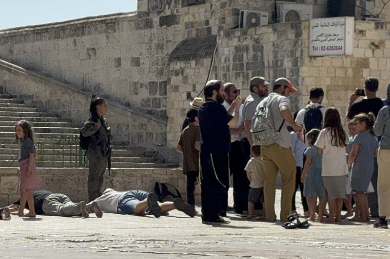 Grup halinde yüksek sesle yapılan Yahudi duaları. Şarkılar, danslar. Erkekler secdeye kapanmış, yüzlerini yere bastırmış. İsrail bayrakları havaya kaldırılmış.
