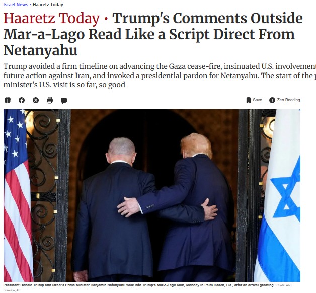 Gazze'de yürütülen ve uluslararası kamuoyunda giderek daha yüksek sesle "soykırım" olarak nitelenen saldırıların mimarı Netanyahu'nun, Trump'ın gölgesinde ayakta durmaya çalıştığı bu ziyaret, İsrail basınında "iyi görüntü verilmiş ama risklerle dolu" bir temas olarak değerlendirildi.