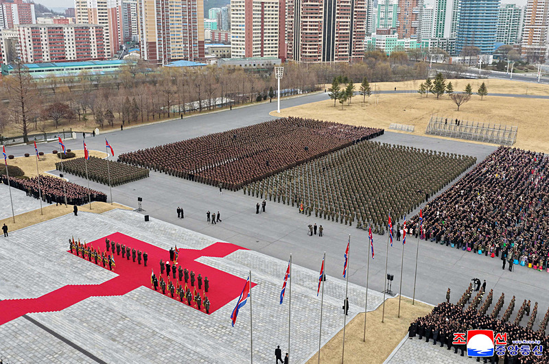 Törene bizzat katılan Kuzey Kore lideri Kim Jong Un, askerleri selamlarken görev sırasında hayatını kaybeden dokuz personel için de saygı duruşunda bulundu.