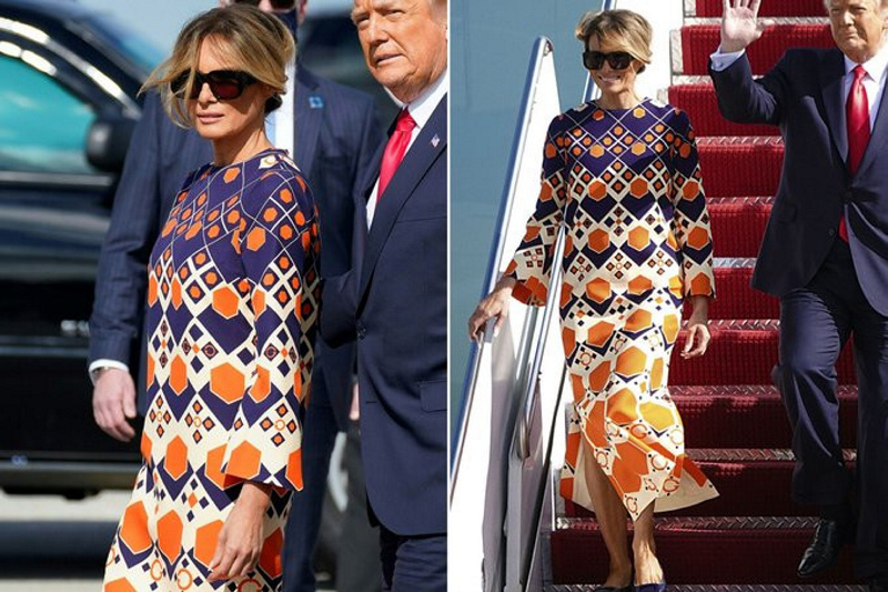 Uçaktan indikleri sırada kameralara poz ceren Melania Trump'ın 3 bin 700 dolarlık turuncu bir elbise giydiği Amerikan medyasının objektifine takıldı.