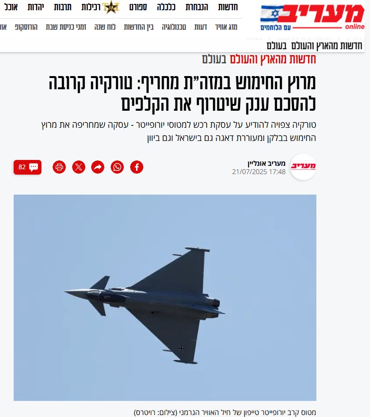 Tel Aviv merkezli Maariv gazetesinin haberine göre, Türkiye'nin Eurofighter Typhoon savaş uçağı alımında son aşamaya geldiği yönündeki gelişmeler İsrail'de tedirginliğe yol açtı.