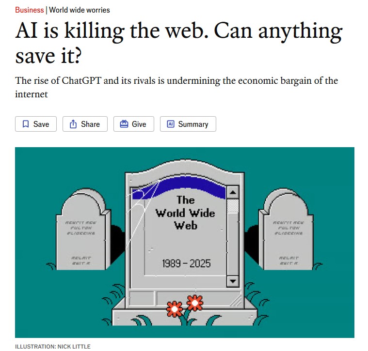 The Economist dergisinde yer alan kapsamlı analizde, sohbet robotlarının (ChatGPT ve benzerleri) yaygınlaşmasının, geleneksel web sitelerinin insan trafiğinde ciddi düşüşlere yol açtığı bildirildi. Kullanıcıların arama motorları yerine yapay zekâya yönelmesiyle birlikte, haber siteleri, referans kaynakları ve forumlar dahil olmak üzere çok sayıda web sitesi "ölüyor."