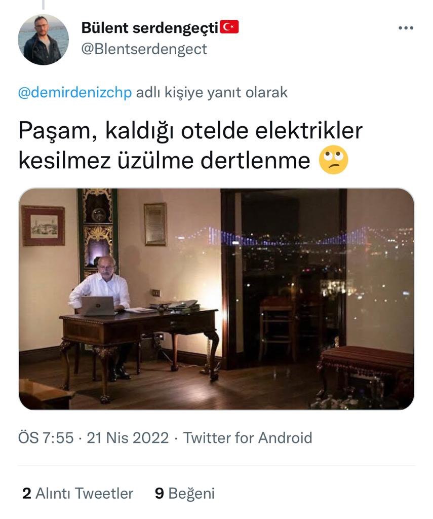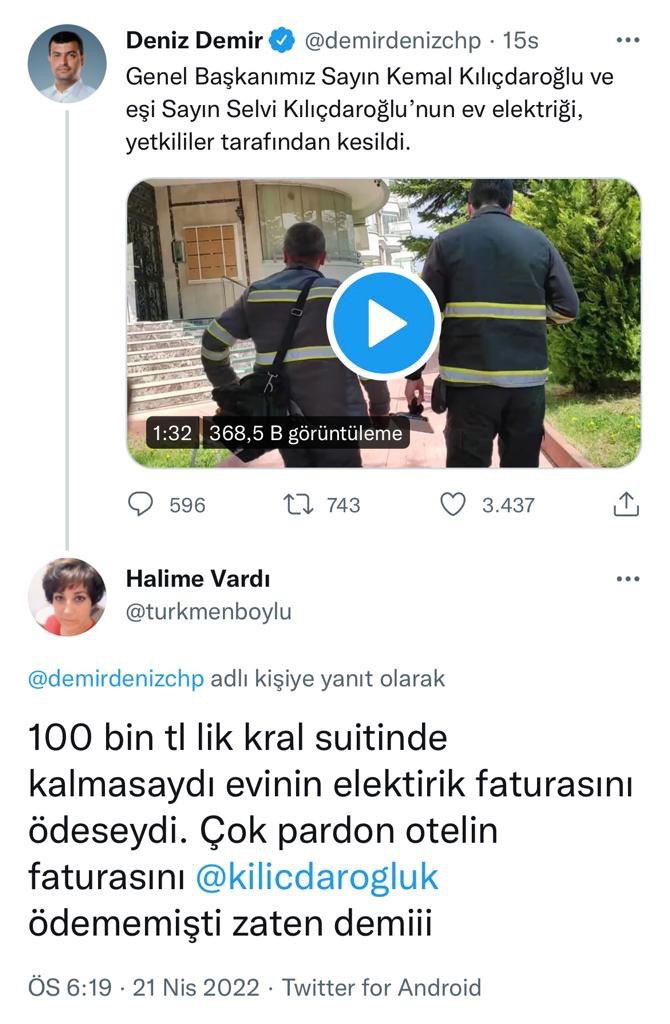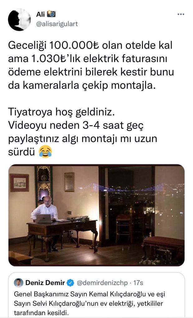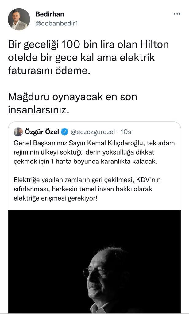 CHP Genel Başkanı Kemal Kılıçdaroğlu'nun, 3 aydır faturasını ödemediği için elektriklerinin kesildiğini açıklaması kamuoyunda inandırıcı bulunmadı. Kemal Kılıçdaroğlu'nun bir hafta boyunca karanlıkta kalacağına yönelik paylaşımda bulunan CHP Genel Başkan Başdanışmanı Deniz Demir ve CHP Grup Başkanvekili Özgür Özel'in paylaşımlarına ilginç cevaplar verdi ve Kemal Kılıçdaroğlu'nun bir gecesi 100 bin TL olan Hilton'da konakladığına dikkat çekti.