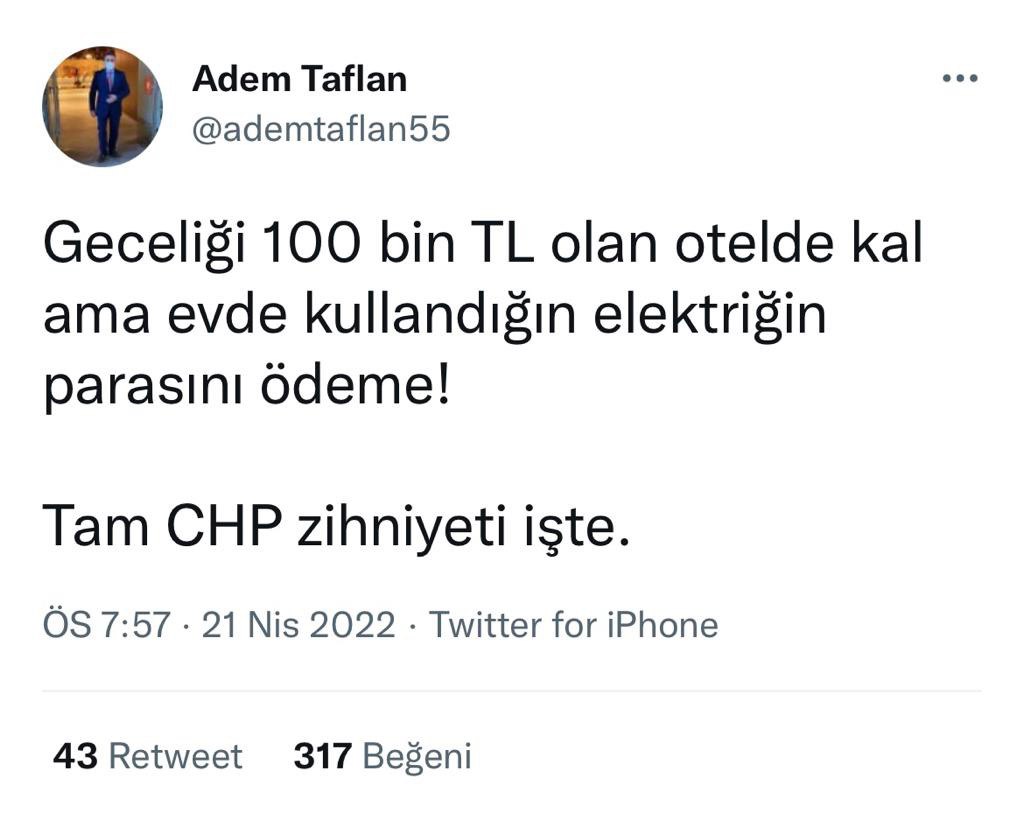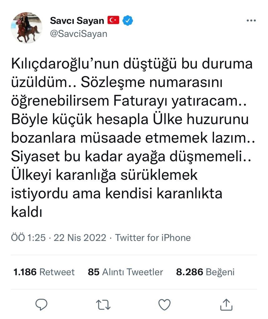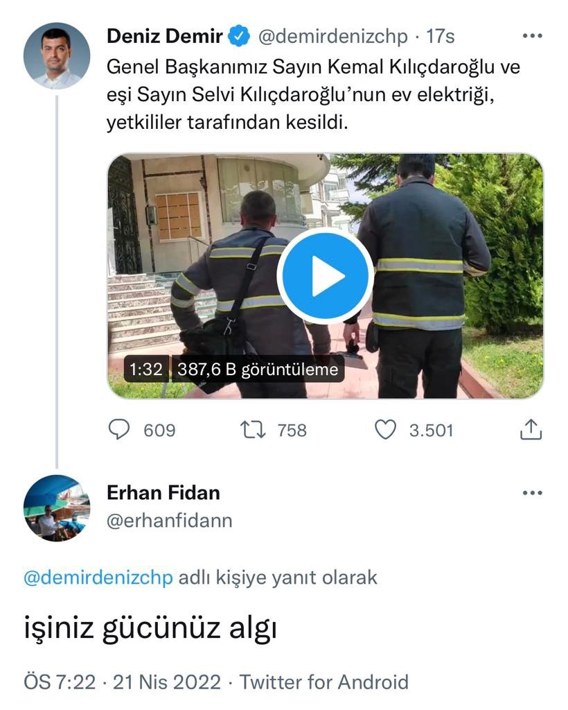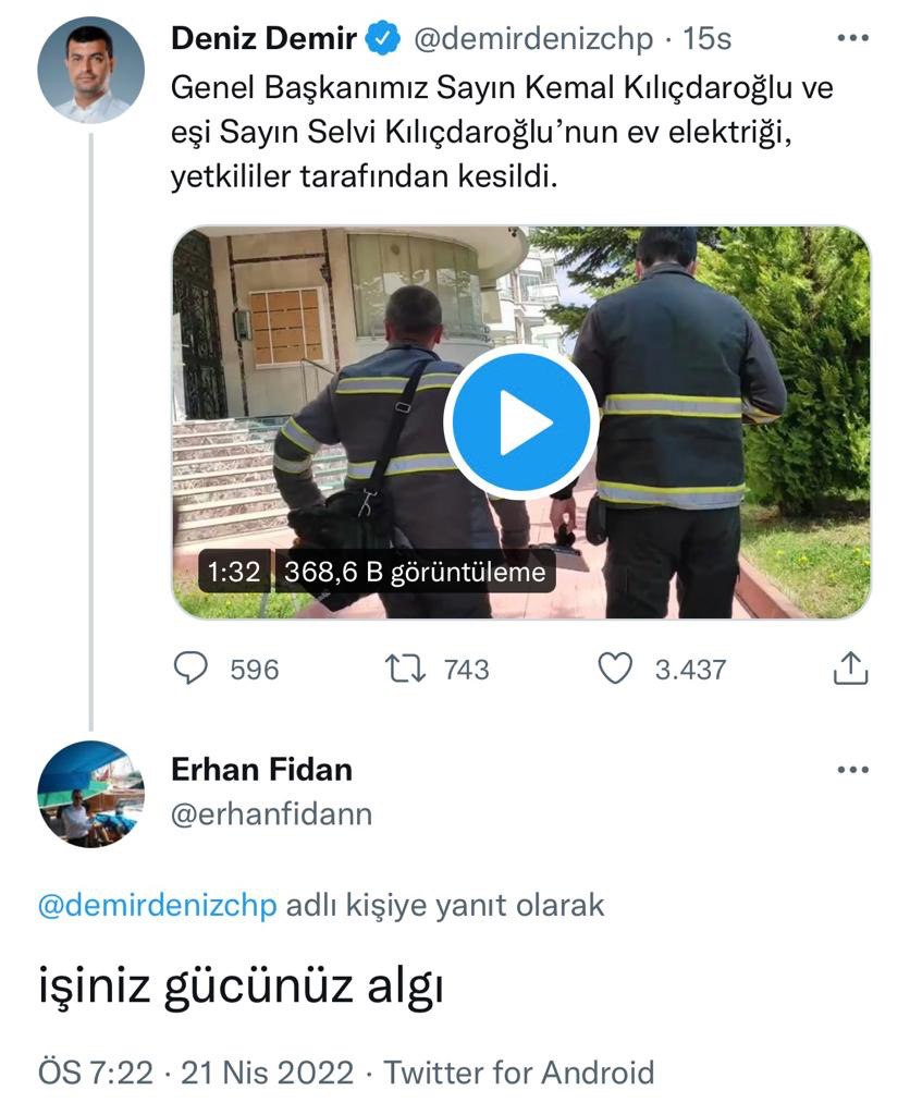 CHP Genel Başkanı Kemal Kılıçdaroğlu'nun, 3 aydır faturasını ödemediği için elektriklerinin kesildiğini açıklaması kamuoyunda inandırıcı bulunmadı. Kemal Kılıçdaroğlu'nun bir hafta boyunca karanlıkta kalacağına yönelik paylaşımda bulunan CHP Genel Başkan Başdanışmanı Deniz Demir ve CHP Grup Başkanvekili Özgür Özel'in paylaşımlarına ilginç cevaplar verdi ve Kemal Kılıçdaroğlu'nun bir gecesi 100 bin TL olan Hilton'da konakladığına dikkat çekti.