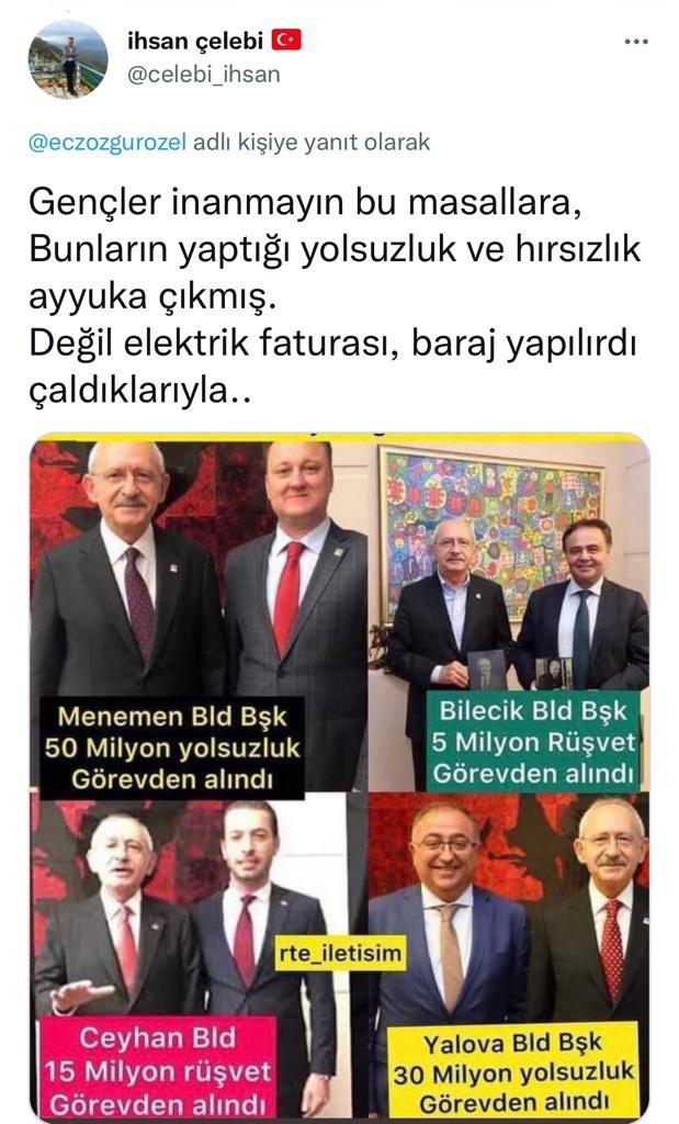 İhsan Çelebi ise, CHP'li belediyelerde yaşanan yolsuzluklarını hatırlattı. Çelebi; Menemen Belediye Başkanı'nın 50 milyon, Yalova Belediye Başkanı'nın 20 milyon, Ceylan Belediye Başkanı'nın 15 milyon, Bilecik Belediye Başkanı'nın 5 milyon TL yolsuzluk ve rüşvet aldıkları gerekçesiyle görevden alındıkları veya tutuklandığını hatırlatarak, "Gençler inanmayın bu masallara. Bunların yaptığı yolsuzluk ve hırsızlık ayyuka çıkmış. Değil elektrik faturası, baraj yapılırdı çaldıklarıyla.." dedi.