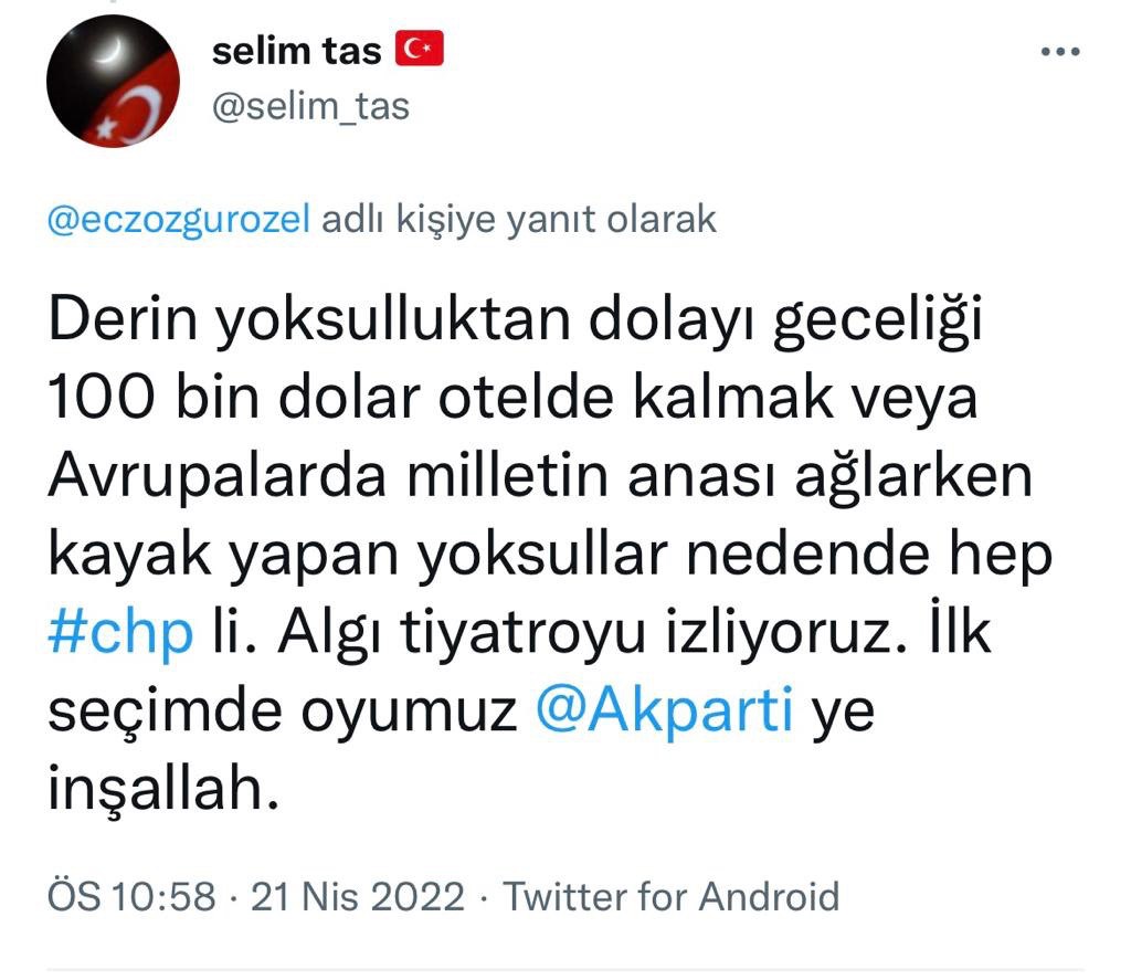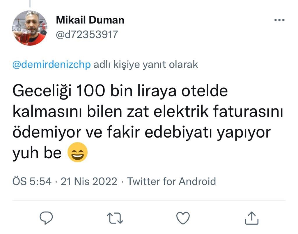 Vatandaşlar; Deniz Demir ve Özgür Özel'e paylaşımlarına tepki gösterdi ve "Aylık 300 TL'lik elektrik faturasını ödemediği için elektriği kesilen Kılıçdaroğlunun, geceliği 100.000 TL olan otele geçip halka halkçılık dersi vermesi bekleniyor… Kılıçdaroğlu'nun bir gecelik otel masrafı ile 25 yıl boyunca elektrik faturası ödeyebileceğini biliyor muydunuz?" ifadelerini kullandı.