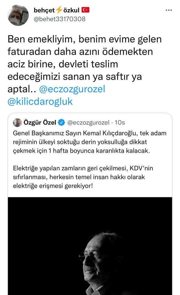 Vatandaşlar; CHP Grup Başkanvekili ve Manisa Milletvekili Özgür Özel'in, "Genel Başkanımız Sayın Kemal Kılıçdaroğlu, tek adam rejiminin ülkeyi soktuğu derin yoksulluğa dikkat çekmek için 1 hafta boyunca karanlıkta kalacak" ve CHP Parti Meclisi Üyesi ve Genel Başkan Başdanışmanı Deniz Demir'in, "Genel Başkanımız Sayın Kemal Kılıçdaroğlu ve eşi Sayın Selvi Kılıçdaroğlu'nun ev elektriği, yetkililer tarafından kesildi" şeklindeki paylaşımlarına şöyle tepki gösterdi: