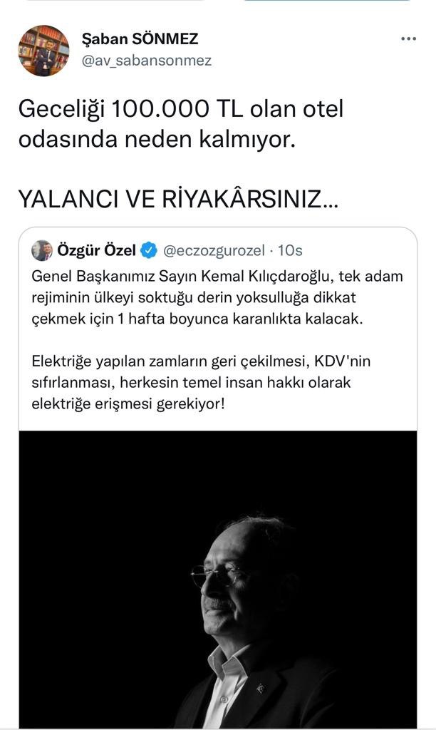 Vatandaşlar; Kemal Kılıçdaroğlu'nun bir hafta boyunca karanlıkta kalacağına yönelik paylaşımda bulunan CHP Parti Meclisi Üyesi ve Genel Başkan Başdanışmanı Deniz Demir ve CHP Grup Başkanvekili ve Manisa Milletvekili Özgür Özel'in sosyal paylaşım sitesi Twitter'daki paylaşımlarına ilginç cevaplar verdi ve Kemal Kılıçdaroğlu'nun bir gecesi 100 bin TL olan Hilton'da konakladığına dikkat çekti.