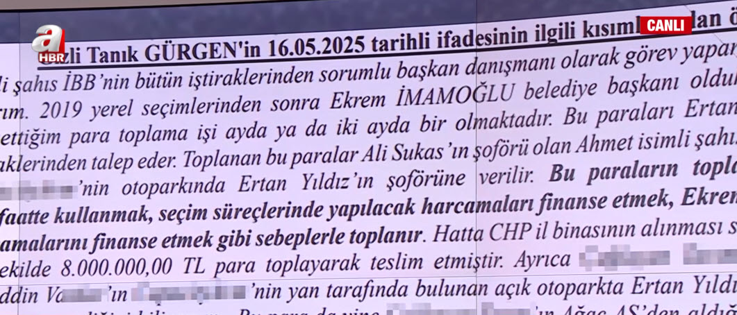 İddianameden satır başları bunlar. Bunlar bizim söylemiş olduğumuz cümleler, söylemiş olduğumuz kelimeler değil, iddianamenin içinde yer alan bilgiler. Şimdi Gizli Tanık Gürgen'in vermiş olduğu ifadede, "Ertan Yıldız isimli şahıs İBB'nin bütün iştiraklerinden sorumlu başkan danışmanı olarak görev yapar. Kendisini bu şekilde tanırım. 2019 yerel seçimlerinden sonra Ekrem İmamoğlu belediye başkanı olduktan sonra, yukarıda bahsettiğim para toplama işi ayda bir ya da iki ayda bir olmaktadır. Bu paralar Ekrem İmamoğlu'nun İBB'nin tüm iştiraklerinden talep eder.