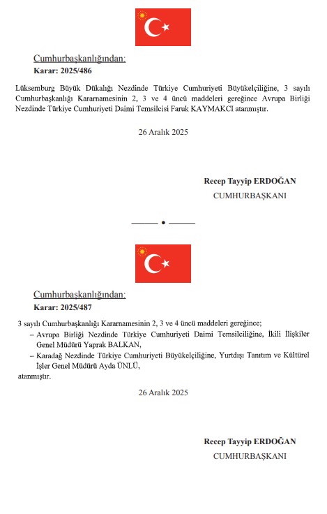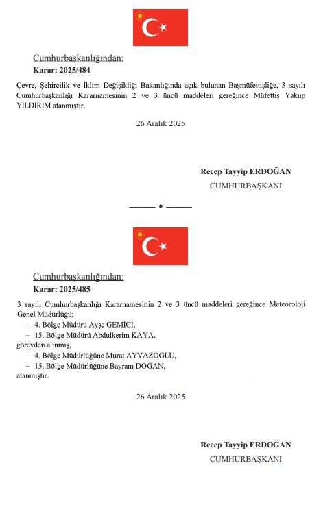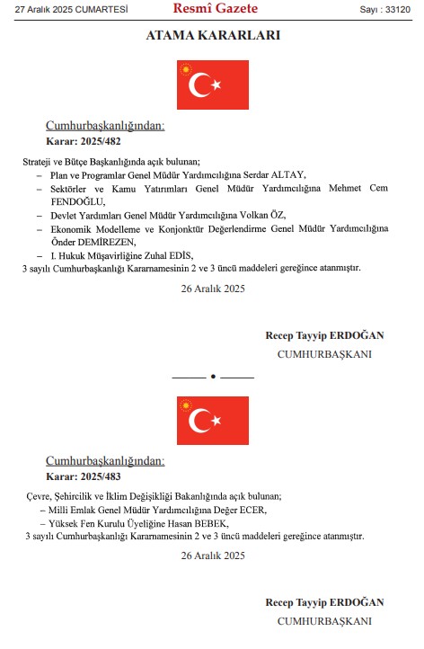 Cumhurbaşkanlığı atama kararları Başkan Erdoğan'ın imzasının ardından 27 Aralık 2025 tarihli Resmi Gazete'de yayımlanarak yürürlüğe girdi. Buna göre alınan kararlar kapsamında bakanlıklara yeni isimler getirildi.