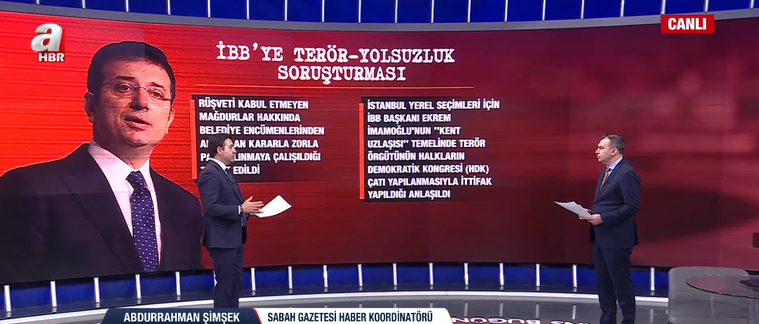 İBB Başkanı Ekrem İmamoğlu neden gözaltında? İmamoğlu'na yönelik suçlamalar neler? İBB soruşturmasındaki kilit ismi Azad Barış kimdir? Sabah Gazetesi Haber Koordinatörü Abdurrahman Şimşek, A Haber canlı yayınında elindeki istihbarat raporundan çarpıcı detayları anlattı.