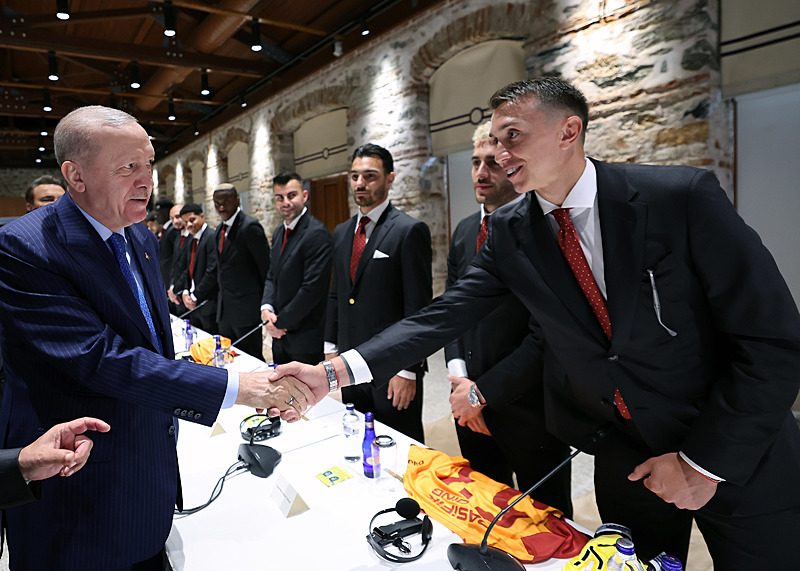 Başkan Recep Tayyip Erdoğan, Galatasaray futbol takımı oyuncularını ve teknik heyeti, Dolmabahçe Çalışma Ofisi'nde kabul etti. Başkan Erdoğan sarı kırmızılı oyuncuları tek tek tebrik ederken Victor Osimhen Başkan Erdoğan'a forma hediye etti.
