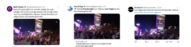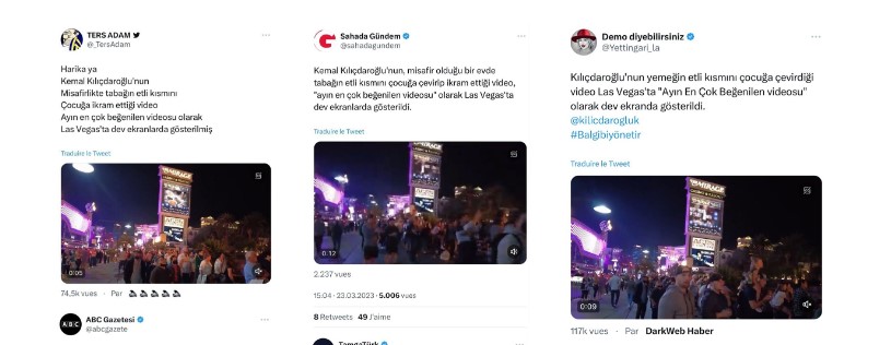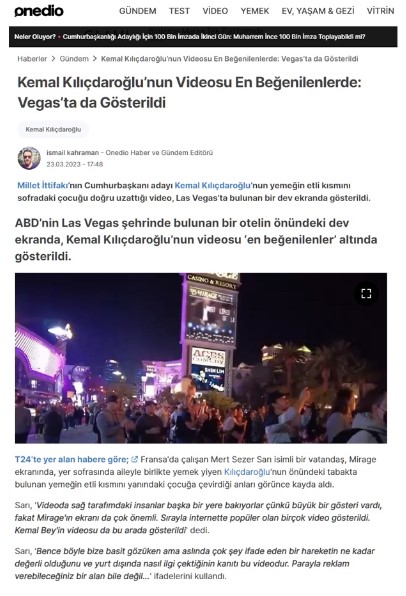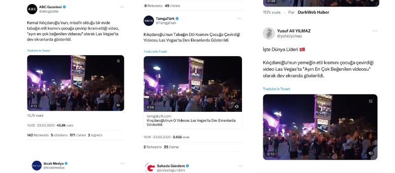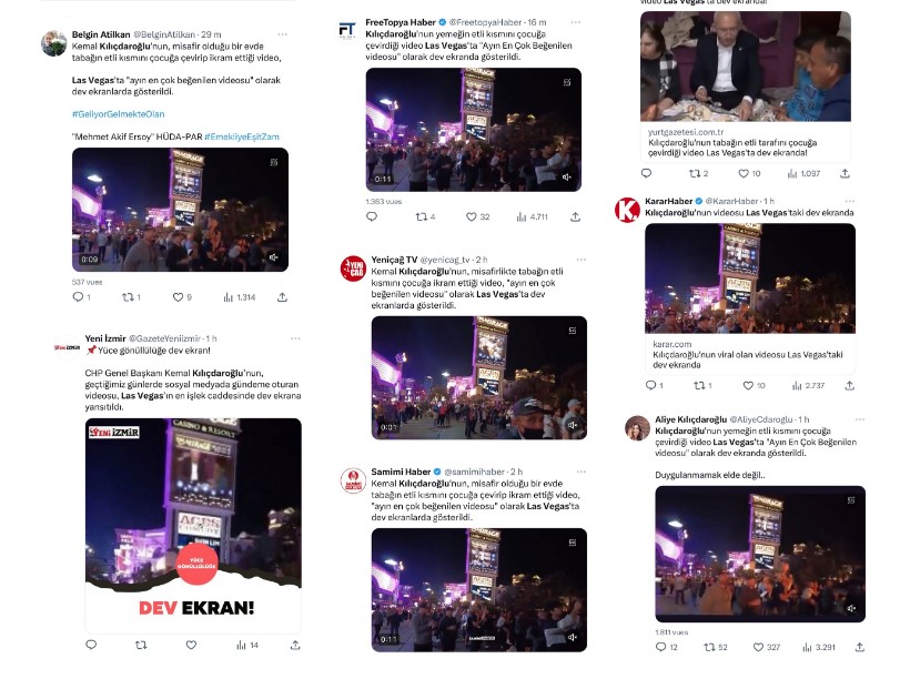 Bugün CHP'nin fonladığı medya kuruluşları ve isimler sosyal medya hesaplarından "Kılıçdaroğlu pilavın etli tarafını çocuğun önüne çevirdi" videosunu dünyanın en çok izlenen videoları arasına girdiği için Las Vegas'taki panolarda yayınlandığı anları büyük bir gururla paylaştı.