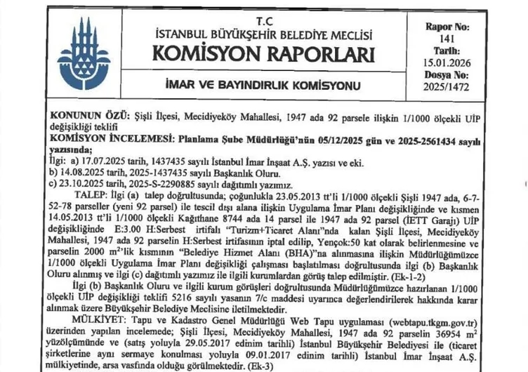 AK Parti grubunun İBB Meclisi'nde çoğunluğu elinde bulundurduğu dönemde 15 Kasım 2019'da 'yeşil alan' ilan edilen Levent'teki eski İETT Garajı'na ait 36 bin metrekarelik dev arazi için İBB Başkanı Ekrem İmamoğlu veto hakkını kullanmıştı.