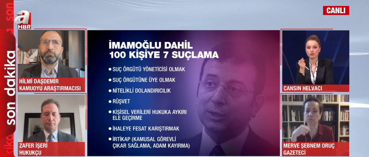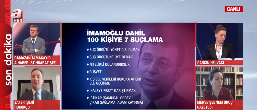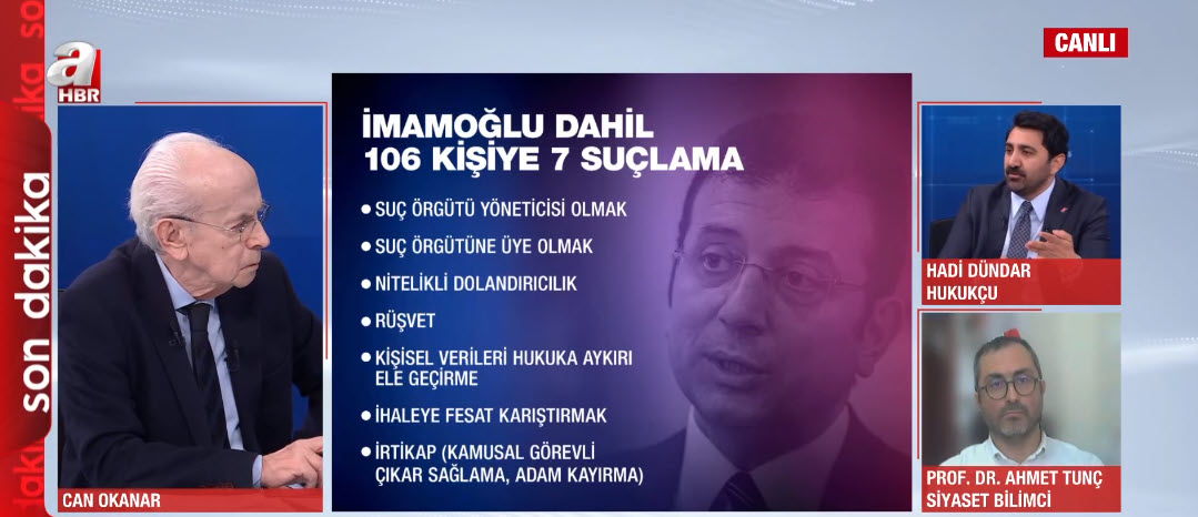 İstanbul Büyükşehir Belediye Başkanı Ekrem İmamoğlu ve 99 şüpheli hakkında gözaltı kararı verildi. İmamoğlu neden gözaltına alındı? Naylon fatura ile para mı akladılar? Siyasete yansıması ne olacak? Avukat Pınar Hacıbektaşoğlu, Avukat Zafer İşeri, Gazeteci Kurtuluş Tayiz ve Gazeteci Merve Şebnem Oruç A Haber'de konu ile ilgili değerlendirmelerde bulundu.