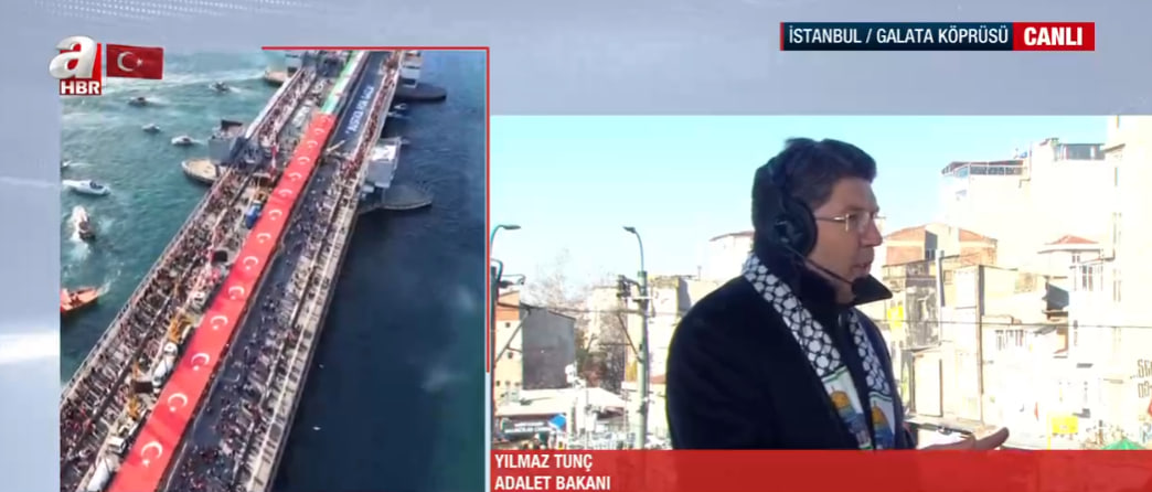 Gazze'deki zulmü haykırmak için 500 bini aşkın vatandaş, sabahın ilk ışıklarıyla Galata Köprüsü'ne akın etti. İstanbul'un tarihi camilerinde sabah namazını kılan yüz binler, 'Susmuyoruz, Sinmiyoruz, Filistin'i Unutmuyoruz' sloganıyla mazlumlara ses olurken Adalet Bakanı Yılmaz Tunç, A Haber canlı yayınında net mesajlar verdi. Türkiye'nin Filistin'in yanında olduğunu belirten Tunç, "Batılı yönetimler İsrail'in yanında oldular, adeta İsrail'e bu suçu işlerken cesaret verdiler." dedi.
