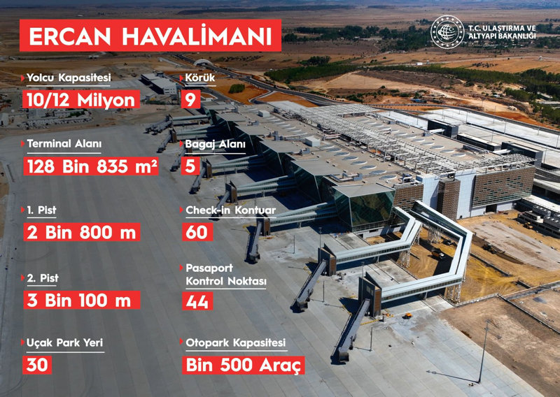 Ulaştırma ve Altyapı Bakanı Abdulkadir Uraloğlu, KKTC Ercan Havalimanı yeni terminal binası ile adeta adanın çehresini değiştireceğini belirterek, "Artan imkân ve kabiliyetleri ile geniş gövdeli uçaklara da ev sahipliği yapacak.