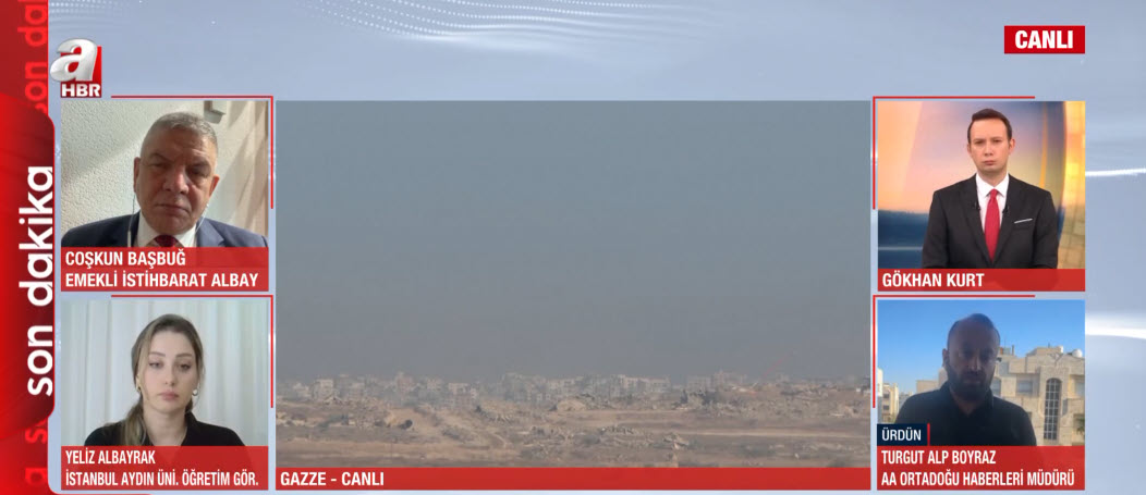 Anadolu Ajansı Orta Doğu Haberleri Müdürü Turgut Alp Boyraz: Şunun altını çizelim zaten Gazze yaklaşık 22 aydır işgal altında. Gazze'nin hemen her yerinde İsrail askerleri var. Neredeyse Gazze'nin yüzde 80'ine yakını yıkıldı. Gazze'de yaşayan 2 milyon 300 bine yakın insanın 70 bine yakını hayatını kaybetti. 200 binden fazla insan yaralandı. Binlerce insan da enkaz altında henüz cenazelerine bile ulaşılamadı.