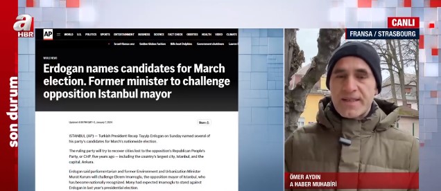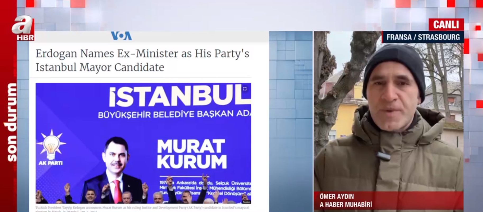 Başkan Recep Tayyip Erdoğan dün Türkiye'nin merakla beklediği ve dünyanın da yakından takip ettiği AK Parti'nin İstanbul Büyükşehir Belediyesi (İBB) başkan adayını Murat Kurum olarak resmen duyurdu. Mega kentin kayıp yıllarının çözüme kavuşması ve hak ettiği özene tekrar kavuşması adına tecrübeli olan Kurum ismi büyük bir heyecan yarattı. Dünya medyasının da dikkatini çeken Eski Çevre, Şehircilik ve İklim Değişikliği Bakanı Kurum ismi manşetlerde yerini aldı. Detayları A Haber muhabiri Öner Aydın, Fransa'nın Strasbourg kentinden aktardı.