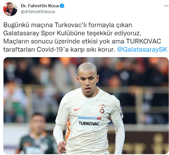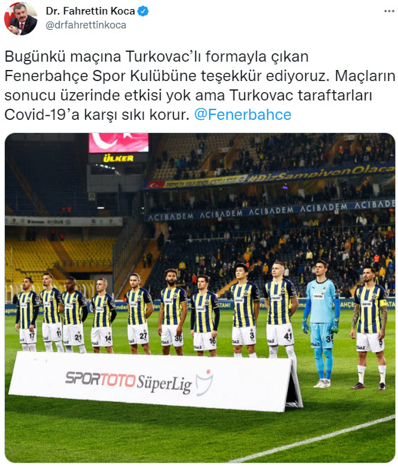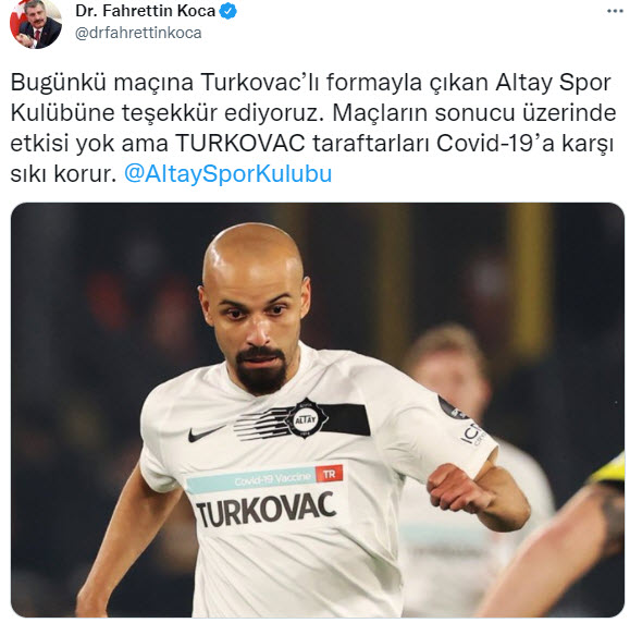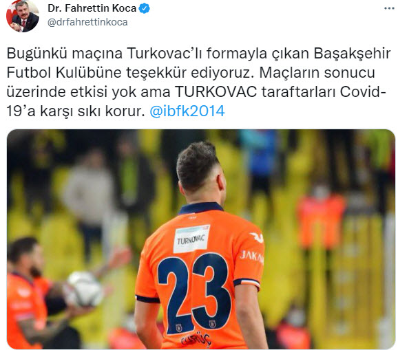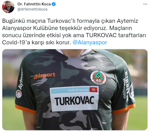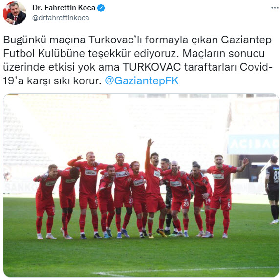 Sağlık Bakanı Fahrettin Koca, bugün oynadıkları maçlara yerli Kovid-19 aşısı TURKOVAC yazılı formalarla çıkan futbol kulüplerine teşekkür etti.