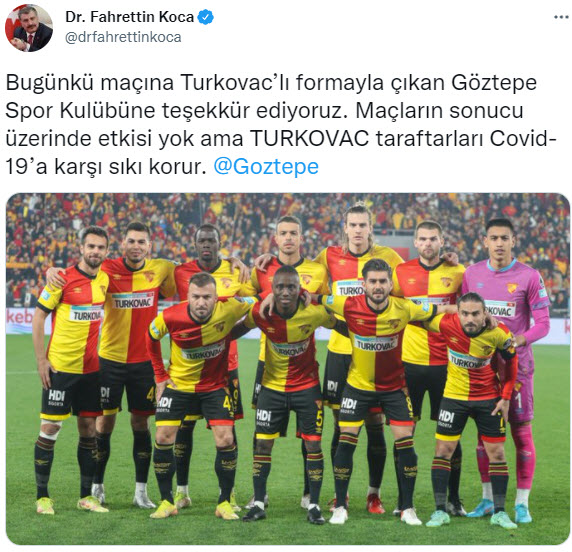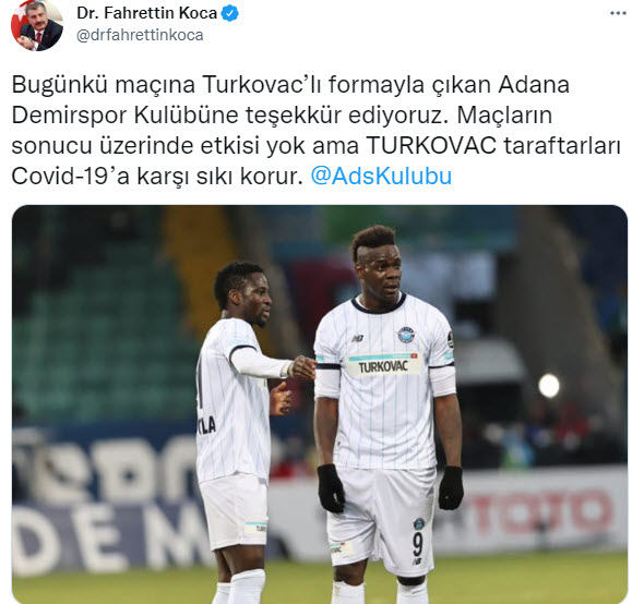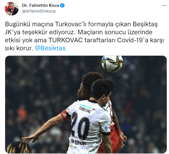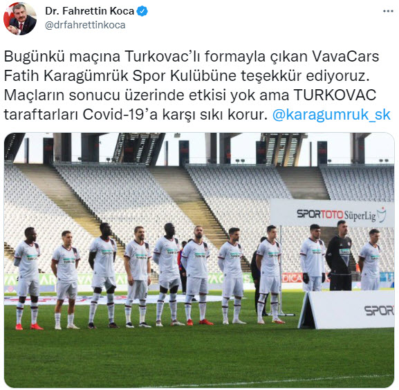 Bakan Koca, Twitter hesabından yaptığı paylaşımlarda, Adana Demirspor, Ankara Keçiörengücü, Aytemiz Alanyaspor, Beşiktaş, Çaykur Rizespor ve Galatasaray kulüplerine teşekkür ederek, "Maçların sonucu üzerinde etkisi yok ama TURKOVAC, taraftarları Kovid-19'a karşı sıkı korur." ifadesini kullandı.