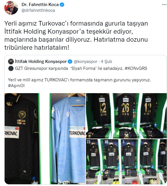 Süper Lig ekipleri 24. haftadaki maçlarına TURKOVAC yazısıyla çıktı. Sağlık Bakanı Fahrettin Koca, bugün oynadıkları maçlara yerli Kovid-19 aşısı TURKOVAC yazılı formalarla çıkan futbol kulüplerine teşekkür etti.