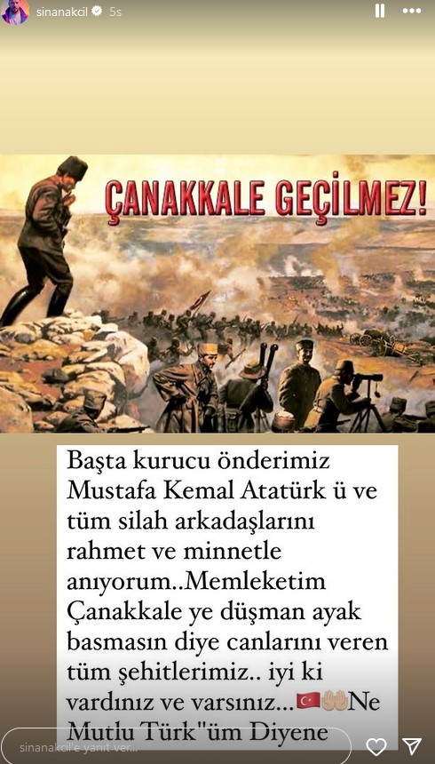 Tam 109 yıl önce, Çanakkale'de tarihin en büyük destanlarından biri yazıldı. Ünlü isimler de 18 Mart 1915 Çanakkale Zaferi'nin yıldönümünde bu önemli günü unutmadılar. Sosyal medya platformlarında bir araya gelen ünlüler, Çanakkale Zaferi'ni anmak ve şehitleri anmak için duygusal paylaşımlarda bulundu.