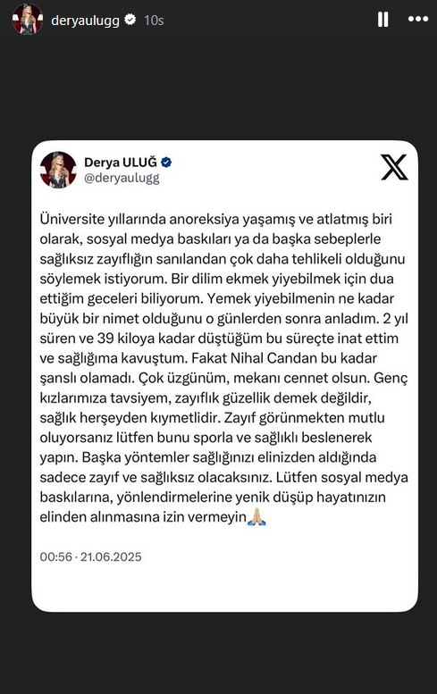 Derya Uluğ, X hesabında yaptığı paylaşımda "Üniversite yıllarında anoreksiya yaşamış ve atlatmış biri olarak, sosyal medya baskıları ya da başka sebeplerle sağlıksız zayıflığın sanılandan çok daha tehlikeli olduğunu söylemek istiyorum. Bir dilim ekmek yiyebilmek için dua ettiğim geceleri biliyorum. Yemek yiyebilmenin ne kadar büyük bir nimet olduğunu o günlerden sonra anladım." ifadelerini kulandı.