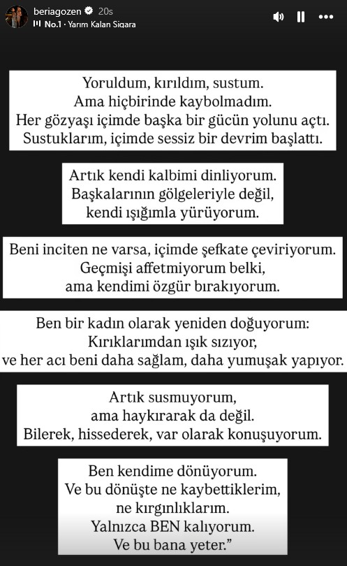 Bu açıklamanın ardından Beria Özden, sosyal medya hesabından eşiyle olan tüm fotoğrafları kaldırdı. Ayrıca yaptığı duygusal bir paylaşımda şu sözlere yer verdi: