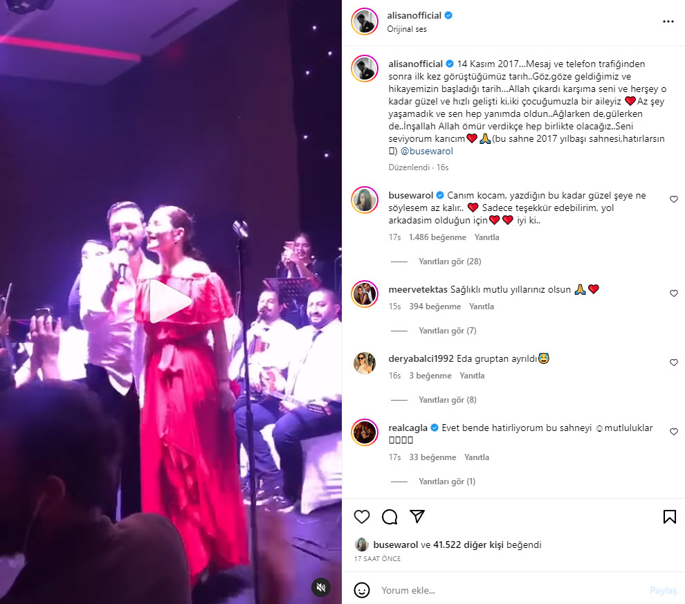 Ünlü şarkıcı, "14 Kasım 2017… Mesaj ve telefon trafiğinden sonra ilk kez görüştüğümüz tarih. Göz göze geldiğimiz ve hikayemizin başladığı tarih… Allah çıkardı karşıma seni ve her şey o kadar güzel ve hızlı gelişti ki iki çocuğumuzla bir aileyiz. Az şey yaşamadık ve sen hep yanımda oldun. Ağlarken de gülerken de… İnşallah Allah ömür verdikçe hep birlikte olacağız… Seni seviyorum karıcım. (bu sahne 2017 yılbaşı sahnesi, hatırlarsın) @busewarol" ifadelerini kullandı.