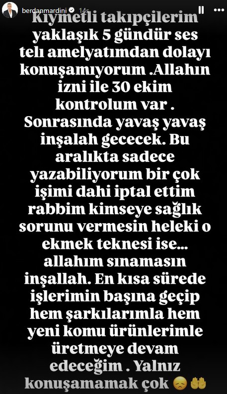 "Kıymetli takipçilerim, 5 gündür ses teli ameliyatımdan dolayı konuşamıyorum. Allah'ın izniyle 30 Ekim kontrolüm var. Sonrasında yavaş yavaş inşallah geçecek.