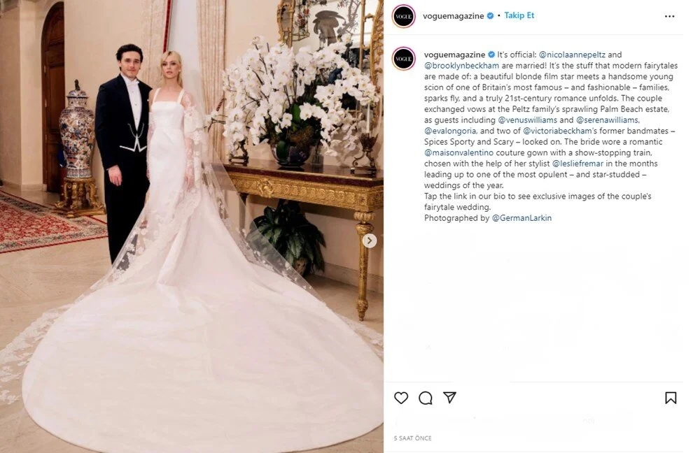 David Beckham ve Victoria Beckham'ın oğlu Brooklyn Beckham uzun süredir aşk yaşadığı Amerikalı oyuncu Nicole Peltz ile dünyaevine girdi. Tüm dünya tarafından beklenen düğünün fotoğraf hakları 2.5 milyon dolara Vogue dergisine satıldı. Sır gibi saklanan törenden ilk görüntüler geldi. 3 gün süren düğünün maliyeti ise dudak uçuklattı.
