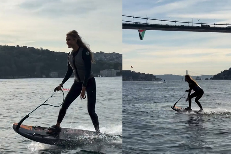 Şıkel, oğulları Uzay ve Kuzey ile birlikte İstanbul Boğaz'ında jet sörf yaptığı anları, takipçileriyle paylaştı.