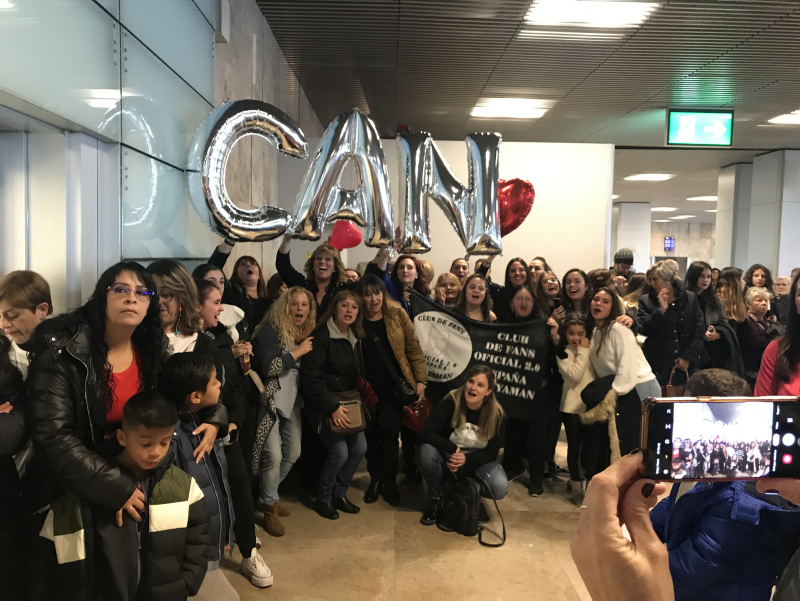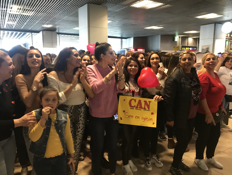 Madrid Barajas Adolfo Suarez Havalimanındaki birinci terminalin çıkışını dolduran Yaman'ın İspanyol hayranlarının, kalp şeklinde ve "Can" yazılı balonlar taşıdığı görüldü.