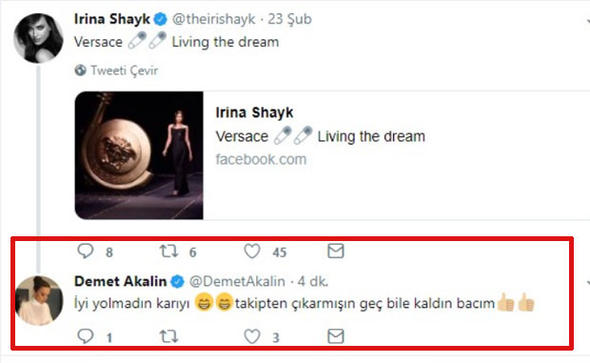 Ünlü şarkıcı Demet Akalın da ünlü modele ilginç bir mesaj attı: İyi yolmadın karıyı... Takipten çıkarmışsın, geç bile kalmışsın bacım