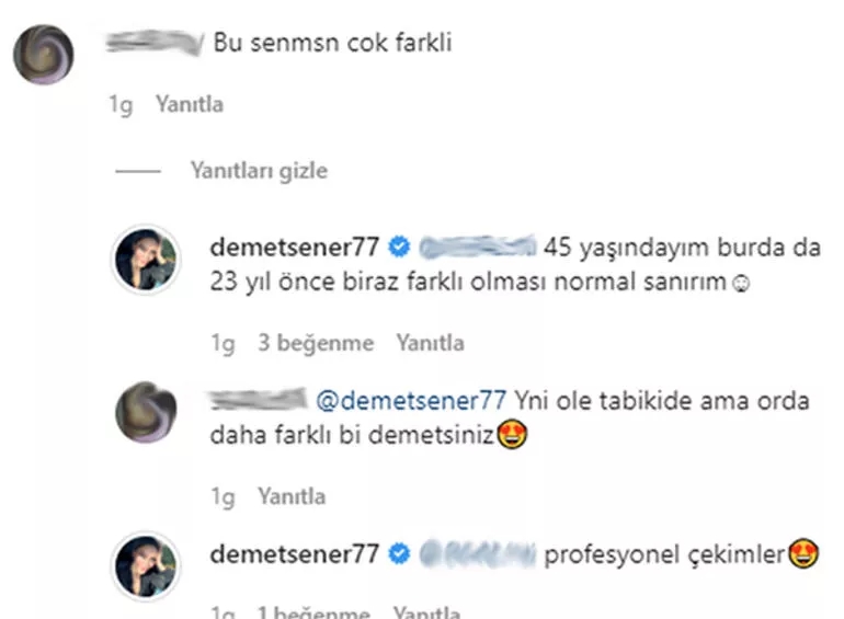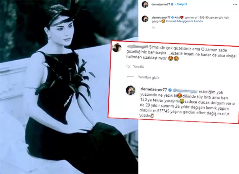 Tolga Arman'la yaşadığı aşkla mutluluğu bulan Deme Şener, sosyal medya paylaşımlarına da ağırlık verdi. Son olarak eski fotoğraflarını yayınlayan ünlü isim, takipçilerini 23 yıl öncesine götürdü. Bir takipçisinin 'estetik' imasında bulunmasına Şener'den yanıt gecikmedi. "Estetiğim yok demekten dilimde tüy bitti" diyen ünlü isim kemik yapısının değiştiğini söyledi.