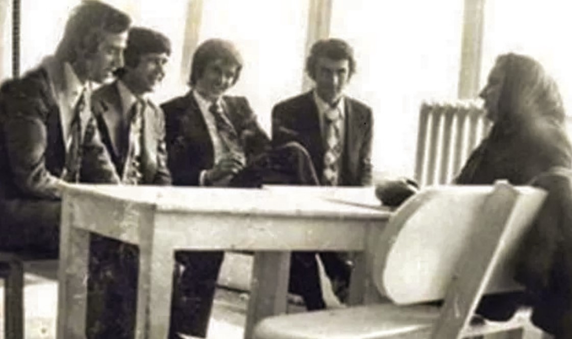 Yıl 1975: Kemal Sunal, Halit Akçatepe, Tarık Akan, Dilaver Gür ve Adile Naşit "Hababam Sınıfı" setindeyken.