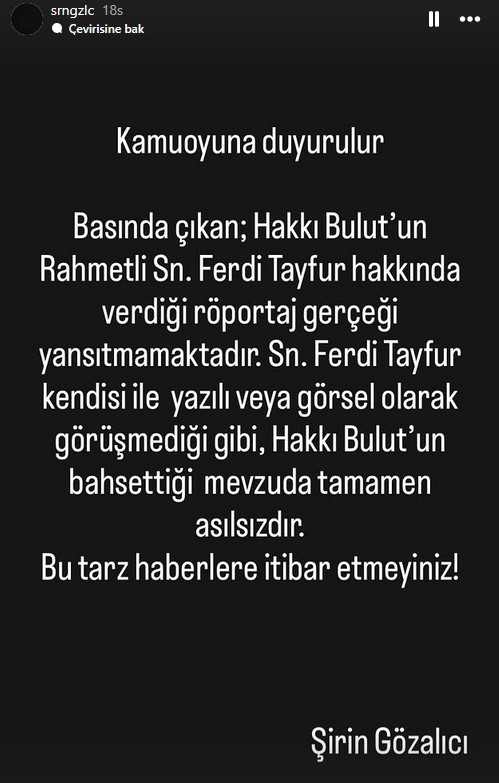 Instagram hesabından paylaşım yapan Gözalıcı, "Hakkı Bulut'un Ferdi Tayfur hakkında verdiği röportaj gerçeği yansıtmamaktadır. Ferdi Tayfur kendisi ile yazılı veya görsel olarak görüşmediği gibi, Hakkı Bulut'un bahsettiği mevzu tamamen asılsızdır. Bu tarz haberlere itibar etmeyiniz." açıklamasında bulundu.