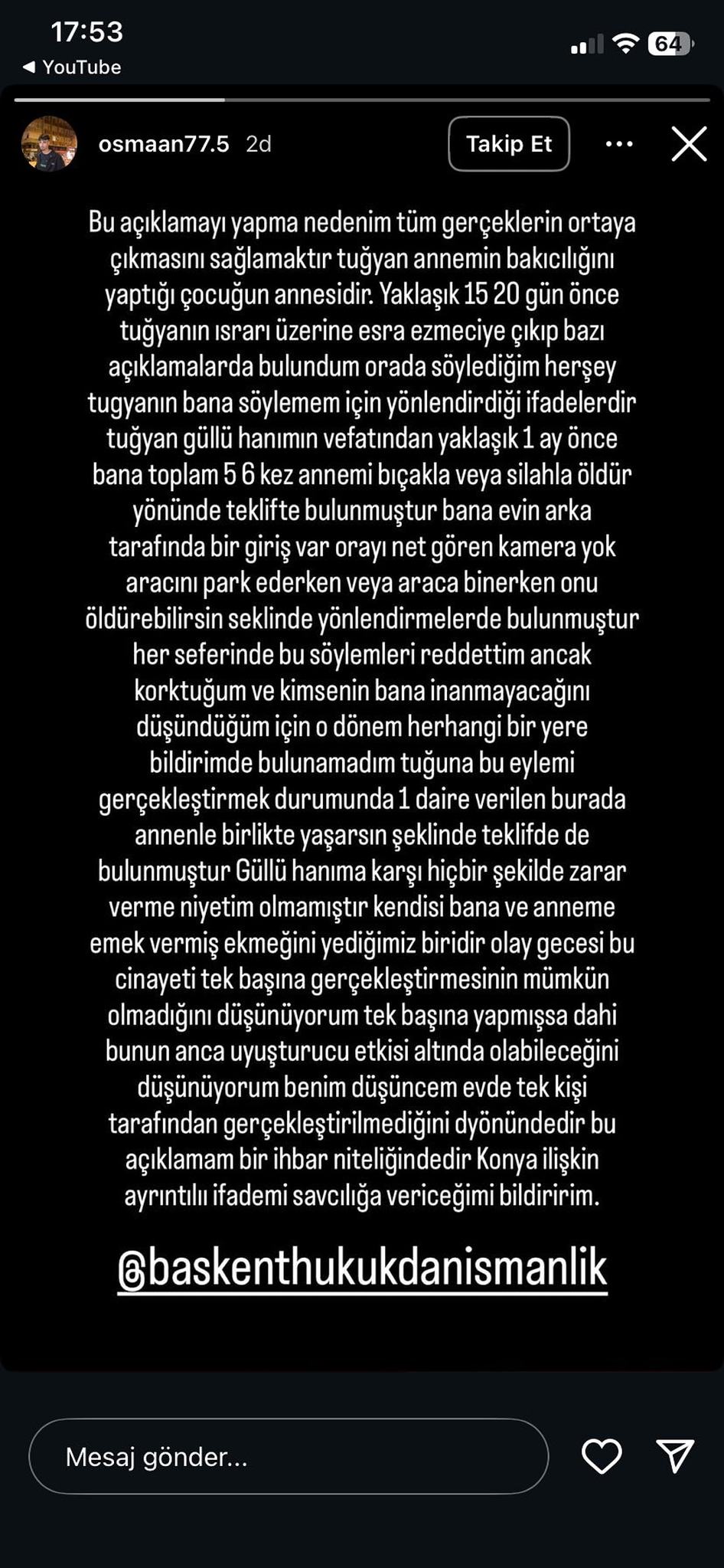 Tuğyan, hakkında ortaya atılan iddialar ise bitmek bilmedi. Baş şüpheli olarak öne çıkan Tuğyan Ülkem Gülter, son olarak "Neler Oluyor Hayatta" programında, gündeme gelen birçok soru işaretine yanıt verdi.
