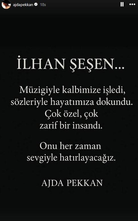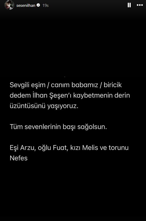 76 yaşındaki Şeşen'in vefatı, sanatçının sosyal medya hesabından yapılan, "Sevgili eşim, canım babamız, biricik dedem İlhan Şeşen'i kaybetmenin derin üzüntüsünü yaşıyoruz. Tüm sevenlerinin başı sağ olsun. Eşi Arzu, oğlu Fırat, kızı Melis ve torunu Nefes" paylaşımı ile duyuruldu.
