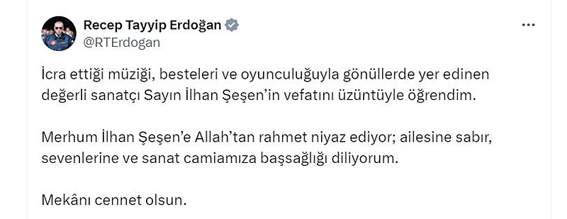Erdoğan mesajında, "İcra ettiği müziği, besteleri ve oyunculuğuyla gönüllerde yer edinen değerli sanatçı Sayın İlhan Şeşen'in vefatını üzüntüyle öğrendim. Merhum İlhan Şeşen'e Allah'tan rahmet niyaz ediyor; ailesine sabır, sevenlerine ve sanat camiamıza başsağlığı diliyorum. Mekânı cennet olsun" ifadelerine yer verdi.