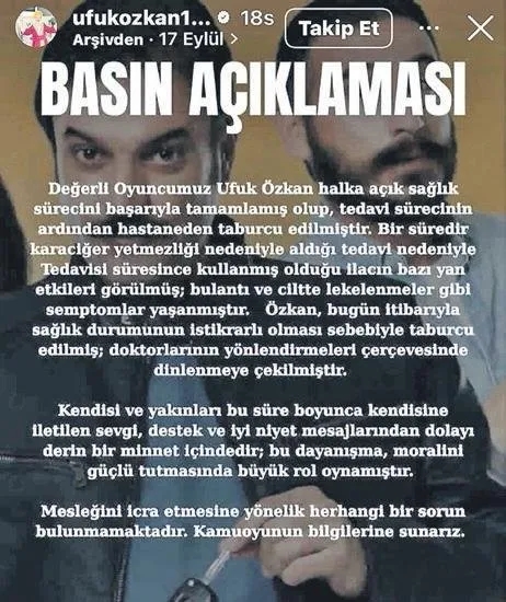 Geçtiğimiz günlerde intihar girişiminde bulunduğu haberleriyle gündeme düşen Ufuk Özkan, yoğun bakımdaki tedavisinin ardından ilk kez konuştu. Sabah Günaydın yazarlarından Tuba Kalçık'a özel açıklamalarda bulunan Özkan, karaciğer rahatsızlığı nedeniyle ağır ilaçlar kullandığını ve iş yoğunluğu nedeniyle ilaçları yanlış zamanlarda aldığını ve bunun neticesinde de zehirlendiğini söyledi. Ünlü oyuncu, "Ne oğlumu ne yapımcımı ne de çalışma arkadaşlarımı yarı yolda bırakacak bir adam değilim." dedi.